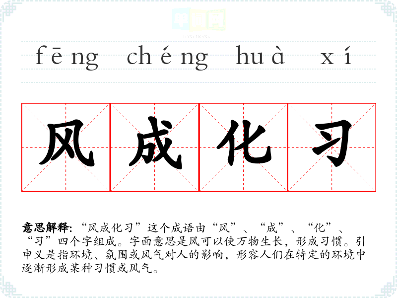 “风成化”这个成语由“风”、“成”、“化”、“”四个字组成。字面意思是风可以使万物生长,形成惯。引申义是指环境、氛围或风气对人的影响,形容人们在特定的环境中逐渐形成某种惯或风气。