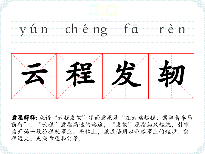 成语“云程发轫”字面意思是“在云端起程,驾驭着车马前行”。“云程”意指高远的路途,“发轫”原指船只起航,引申为开始一段旅程或事业。整体上,该成语用以形容事业的起步、前程远大,充满希望和前景。