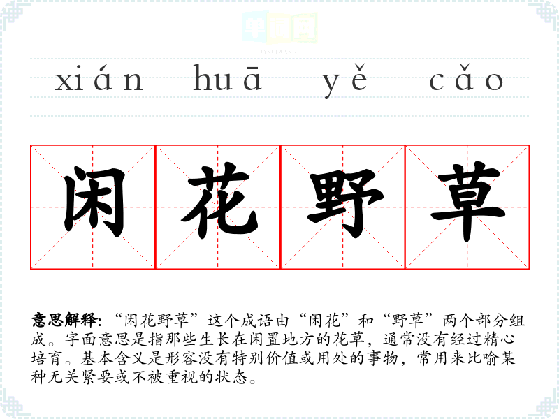 “闲花野草”这个成语由“闲花”和“野草”两个部分组成。字面意思是指那些生长在闲置地方的花草,通常没有经过精心培育。基本含义是形容没有特别价值或用处的事物,常用来比喻某种无关紧要或不被重视的状态。