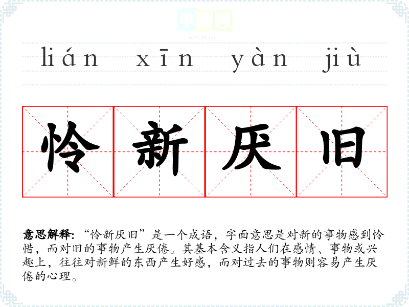 “怜新厌旧”是一个成语,字面意思是对新的事物感到怜惜,而对旧的事物产生厌倦。其基本含义指人们在感情、事物或兴趣上,往往对新鲜的东西产生好感,而对过去的事物则容易产生厌倦的心理。