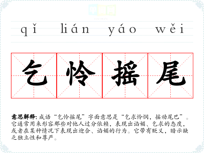 成语“乞怜摇尾”字面意思是“乞求怜悯,摇动尾巴”。它通常用来形容那些对他人过分依赖,表现出谄媚、乞求的态度,或者在某种情况下表现出迎合、谄媚的行为。它带有贬义,暗示缺乏独立性和尊严。