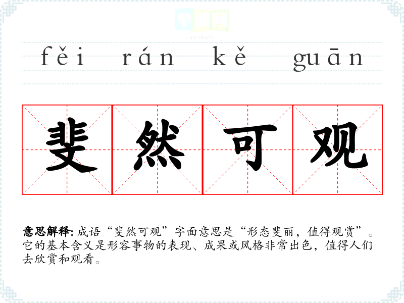 成语“斐然可观”字面意思是“形态斐丽,值得观赏”。它的基本含义是形容事物的表现、成果或风格非常出色,值得人们去欣赏和观看。
