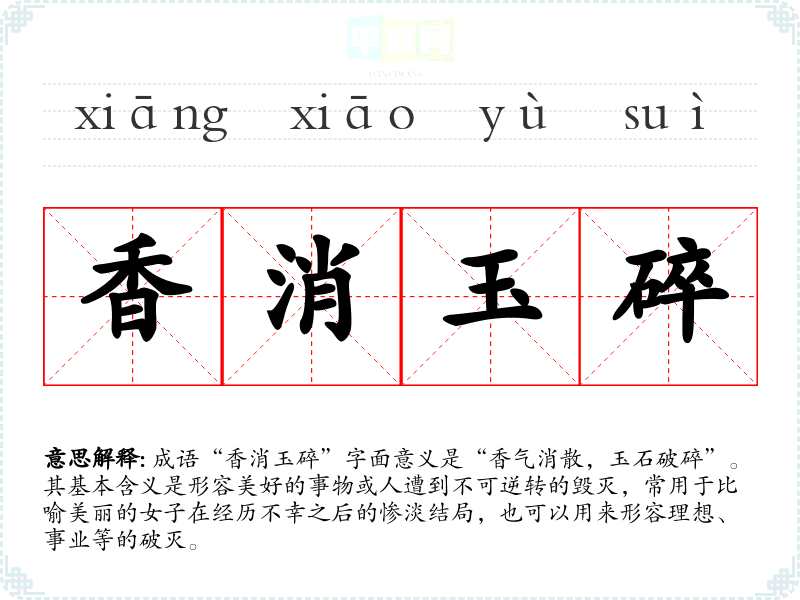 成语“香消玉碎”字面意义是“香气消散,玉石破碎”。其基本含义是形容美好的事物或人遭到不可逆转的毁灭,常用于比喻美丽的女子在经历不幸之后的惨淡结局,也可以用来形容理想、事业等的破灭。