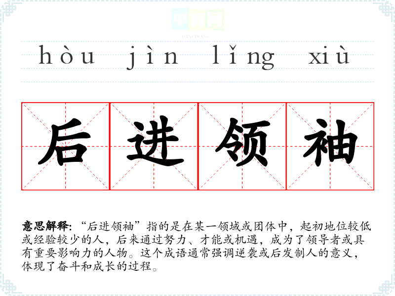 “后进领袖”指的是在某一领域或团体中,起初地位较低或经验较少的人,后来通过努力、才能或机遇,成为了领导者或具有重要影响力的人物。这个成语通常强调逆袭或后发制人的意义,体现了奋斗和成长的过程。