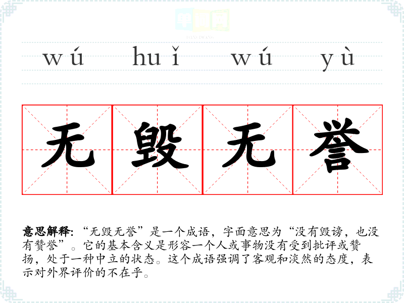 “无毁无誉”是一个成语,字面意思为“没有毁谤,也没有赞誉”。它的基本含义是形容一个人或事物没有受到批评或赞扬,处于一种中立的状态。这个成语强调了客观和淡然的态度,表示对外界评价的不在乎。