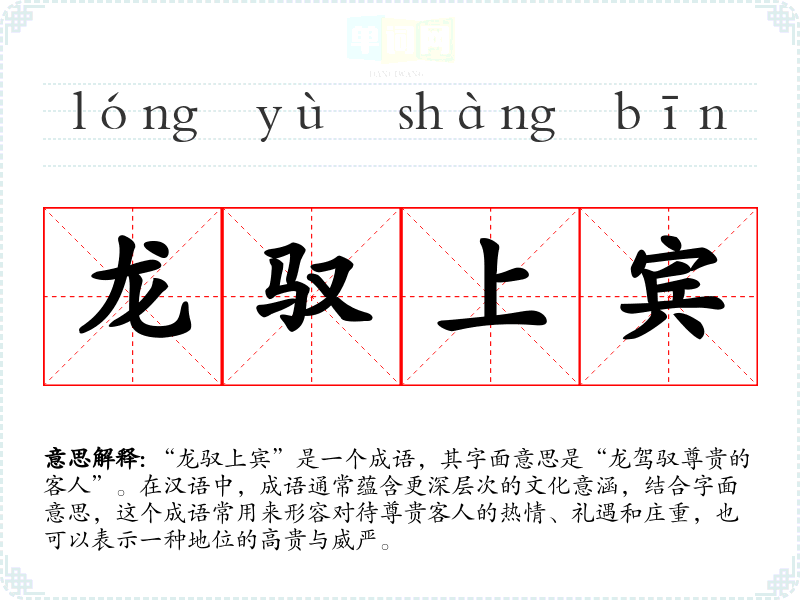 “龙驭上宾”是一个成语,其字面意思是“龙驾驭尊贵的客人”。在汉语中,成语通常蕴含更深层次的文化意涵,结合字面意思,这个成语常用来形容对待尊贵客人的热情、礼遇和庄重,也可以表示一种地位的高贵与威严。