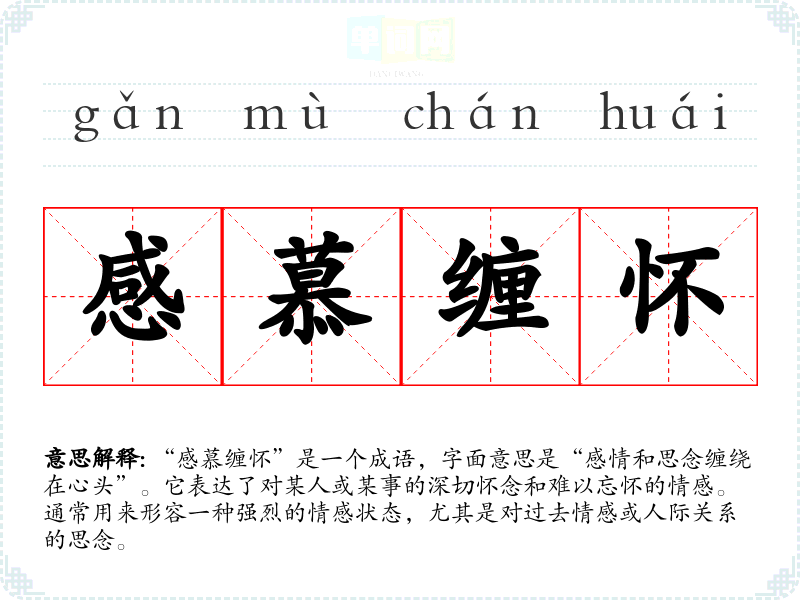 “感慕缠怀”并没有特定的典故或文学出处,但它的构成字词在古代诗词中常见,尤其是在表达思念、感情纠葛的场景中。例如,古诗中常有“怀念”或“思念”的情感描写,体现了对往昔的追忆和对情感的眷恋。