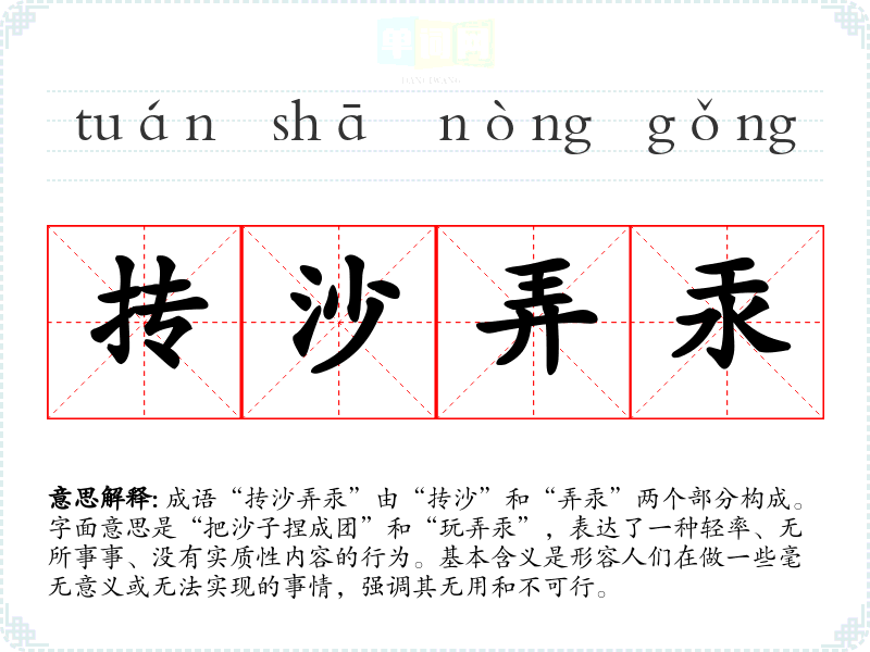 成语“抟沙弄汞”由“抟沙”和“弄汞”两个部分构成。字面意思是“把沙子捏成团”和“玩弄汞”,表达了一种轻率、无所事事、没有实质性内容的行为。基本含义是形容人们在做一些毫无意义或无法实现的事情,强调其无用和不可行。