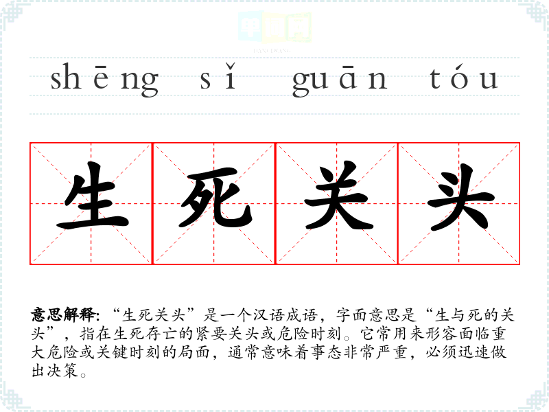 “生死关头”是一个汉语成语,字面意思是“生与死的关头”,指在生死存亡的紧要关头或危险时刻。它常用来形容面临重大危险或关键时刻的局面,通常意味着事态非常严重,必须迅速做出决策。
