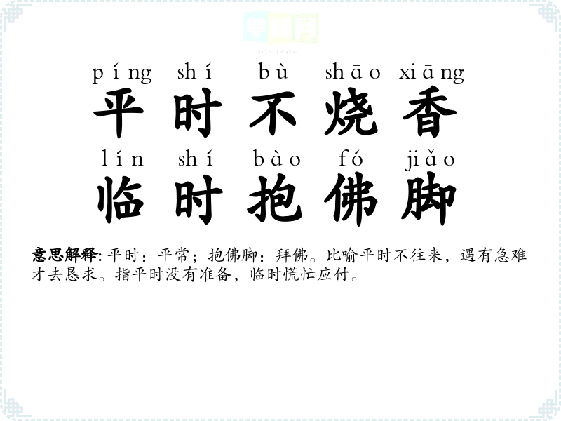 | 平时不烧香,临时抱佛脚 | 平时:平常;抱佛脚:拜佛。比喻平时不往来,遇有急难才去恳求。指平时没有准备,临时慌忙应付。 |