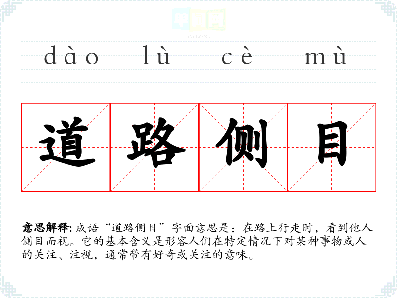 成语“道路侧目”字面意思是:在路上行走时,看到他人侧目而视。它的基本含义是形容人们在特定情况下对某种事物或人的关注、注视,通常带有好奇或关注的意味。