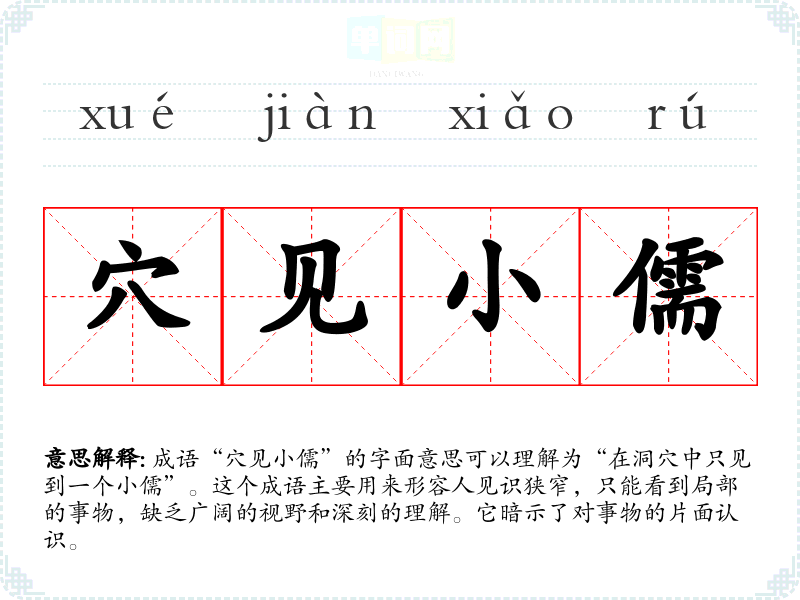 成语“穴见小儒”的字面意思可以理解为“在洞穴中只见到一个小儒”。这个成语主要用来形容人见识狭窄,只能看到局部的事物,缺乏广阔的视野和深刻的理解。它暗示了对事物的片面认识。