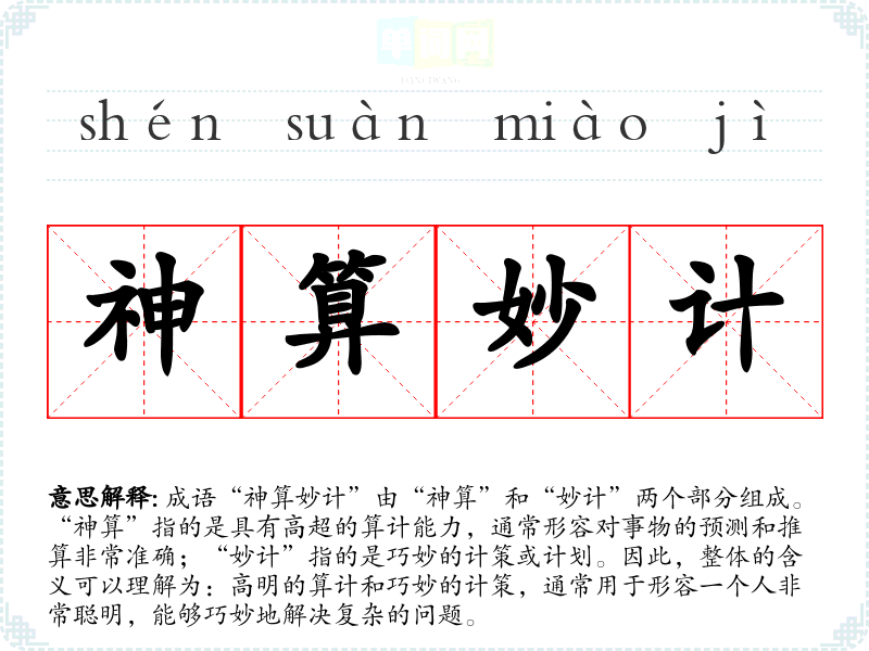 成语“神算妙计”由“神算”和“妙计”两个部分组成。“神算”指的是具有高超的算计能力,通常形容对事物的预测和推算非常准确;“妙计”指的是巧妙的计策或计划。因此,整体的含义可以理解为:高明的算计和巧妙的计策,通常用于形容一个人非常聪明,能够巧妙地解决复杂的问题。