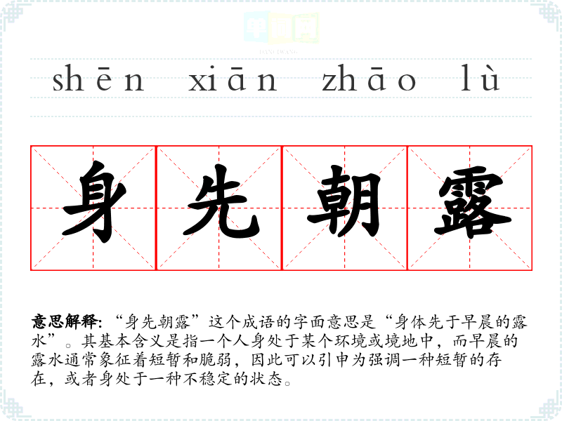 “身先朝露”这个成语的字面意思是“身体先于早晨的露水”。其基本含义是指一个人身处于某个环境或境地中,而早晨的露水通常象征着短暂和脆弱,因此可以引申为强调一种短暂的存在,或者身处于一种不稳定的状态。