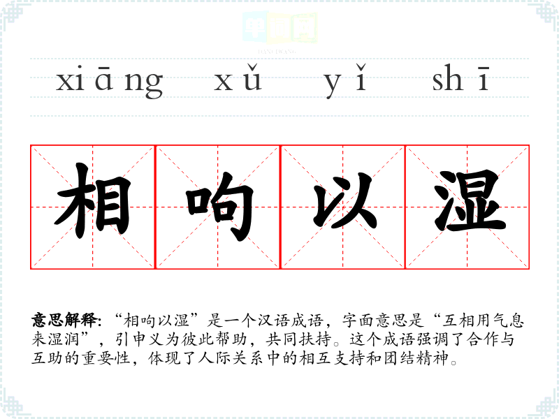 通过对“相呴以湿”的学,我认识到这个成语不仅仅是一个语言符号,更是反映了深厚的人际关系哲学和社会价值观。在语言学和表达中,理解和运用这样的成语可以丰富我的沟通方式,加深对文化的理解,增强表达的力量。