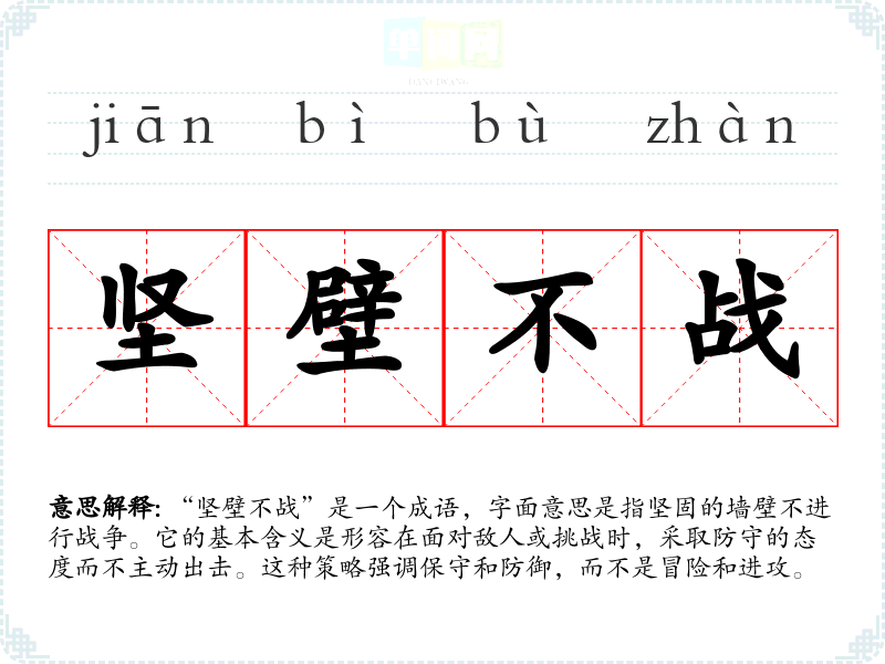 | 坚壁不战 | 坚守壁垒,不与敌人交战。 |