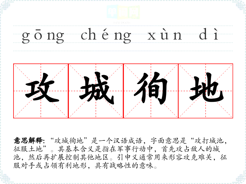 “攻城徇地”是一个汉语成语,字面意思是“攻打城池,征服土地”。其基本含义是指在军事行动中,首先攻占敌人的城池,然后再扩展控制其他地区。引申义通常用来形容攻克难关,征服对手或占领有利地形,具有战略性的意味。