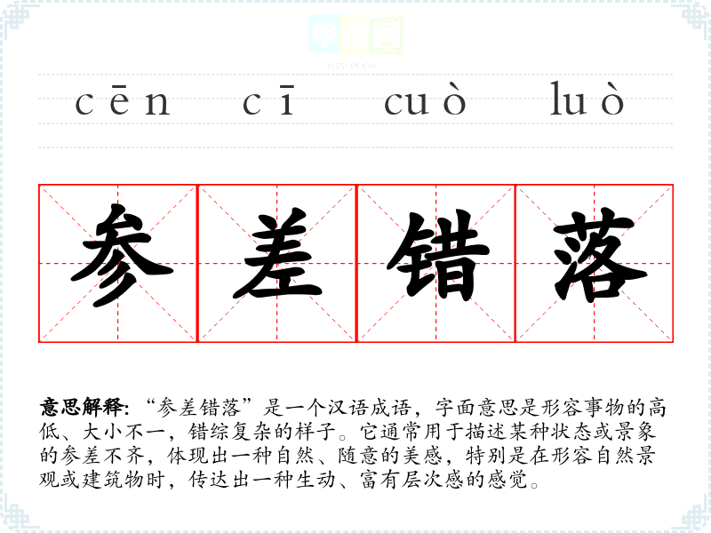 “参差错落”是一个汉语成语,字面意思是形容事物的高低、大小不一,错综复杂的样子。它通常用于描述某种状态或景象的参差不齐,体现出一种自然、随意的美感,特别是在形容自然景观或建筑物时,传达出一种生动、富有层次感的感觉。