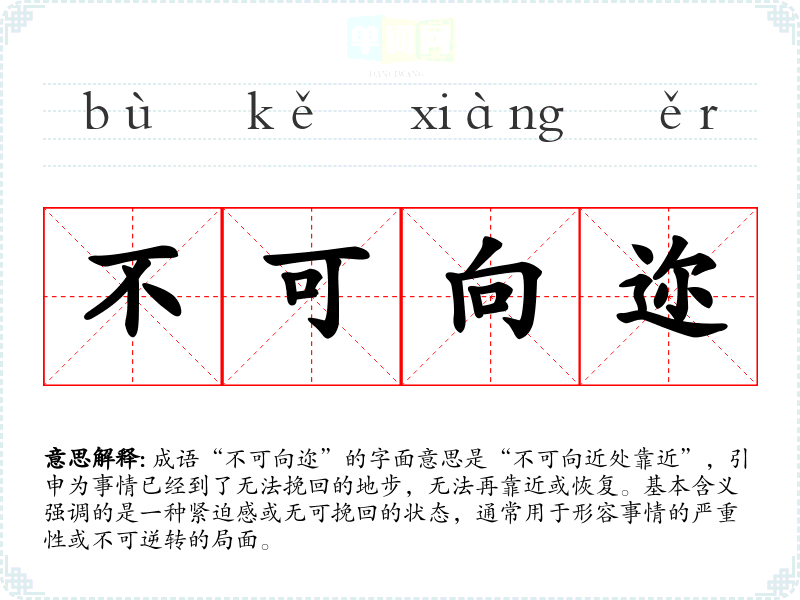 成语“不可向迩”的字面意思是“不可向近处靠近”,引申为事情已经到了无法挽回的地步,无法再靠近或恢复。基本含义强调的是一种紧迫感或无可挽回的状态,通常用于形容事情的严重性或不可逆转的局面。