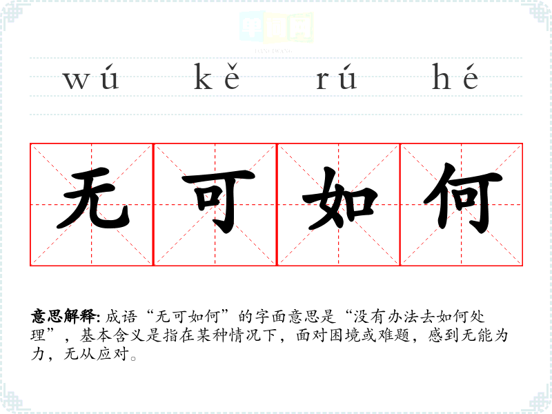 成语“无可如何”的字面意思是“没有办法去如何处理”,基本含义是指在某种情况下,面对困境或难题,感到无能为力,无从应对。