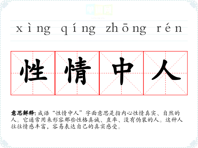 | 性情中人 | 性情:性格。有性格和真情实感的人。 |