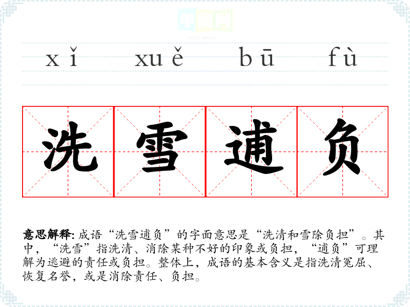 成语“洗雪逋负”的字面意思是“洗清和雪除负担”。其中,“洗雪”指洗清、消除某种不好的印象或负担,“逋负”可理解为逃避的责任或负担。整体上,成语的基本含义是指洗清冤屈、恢复名誉,或是消除责任、负担。