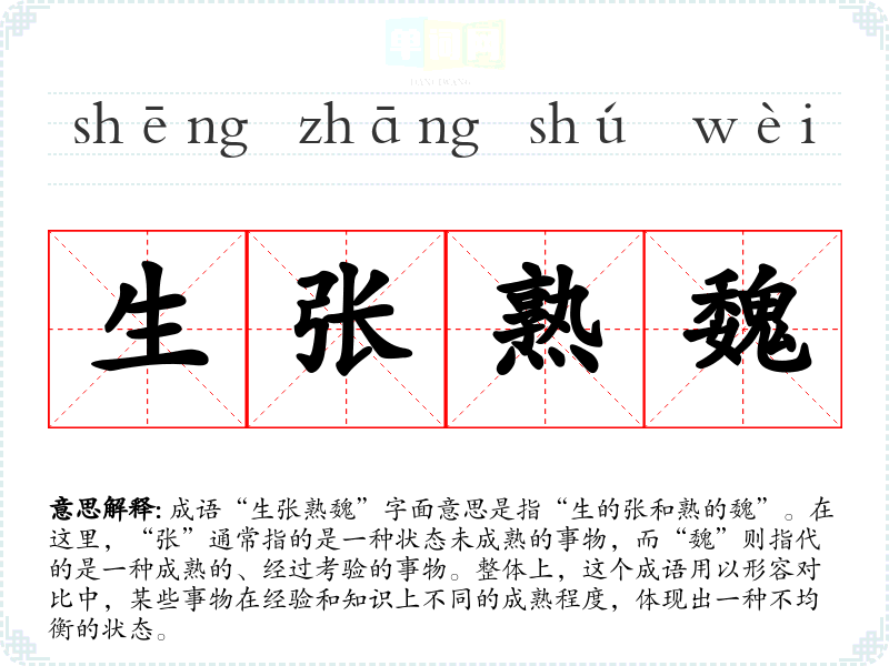 在**文化中,成语往往蕴含着丰富的历史和哲学思考。“生张熟魏”反映了社会对不同层次知识和经验的重视,尤其在教育和职业发展中,强调要通过实践积累经验,才能达到更高的水平。
