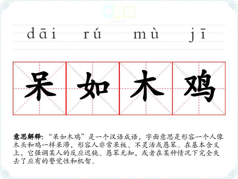 “呆如木鸡”是一个汉语成语,字面意思是形容一个人像木头和鸡一样呆滞,形容人非常呆板、不灵活或愚笨。在基本含义上,它强调某人的反应迟钝、愚笨无知,或者在某种情况下完全失去了应有的警觉性和机智。