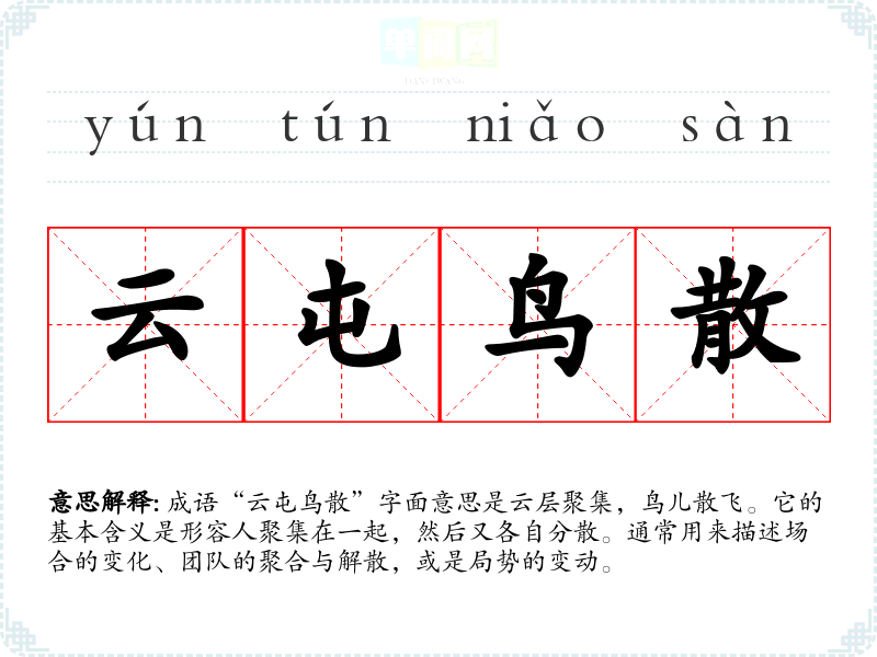 成语“云屯鸟散”字面意思是云层聚集,鸟儿散飞。它的基本含义是形容人聚集在一起,然后又各自分散。通常用来描述场合的变化、团队的聚合与解散,或是局势的变动。
