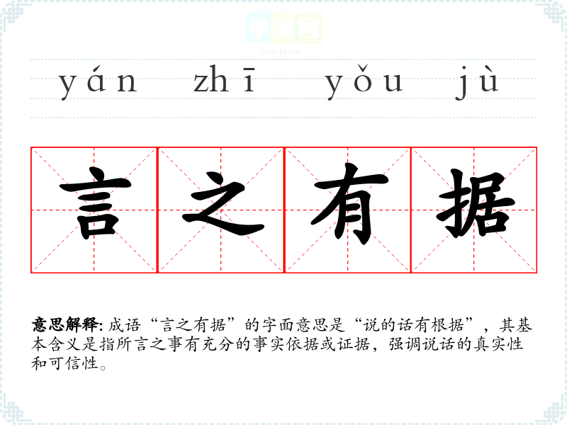 成语“言之有据”的字面意思是“说的话有根据”,其基本含义是指所言之事有充分的事实依据或证据,强调说话的真实性和可信性。