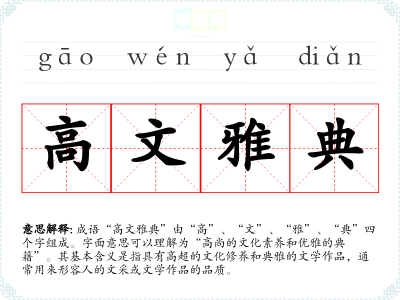成语“高文雅典”由“高”、“文”、“雅”、“典”四个字组成。字面意思可以理解为“高尚的文化素养和优雅的典籍”。其基本含义是指具有高超的文化修养和典雅的文学作品,通常用来形容人的文采或文学作品的品质。
