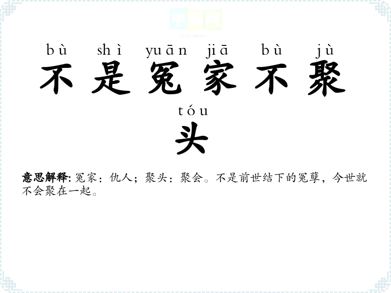 | 不是冤家不聚头 | 冤家:仇人;聚头:聚会。不是前世结下的冤孽,今世就不会聚在一起。 |