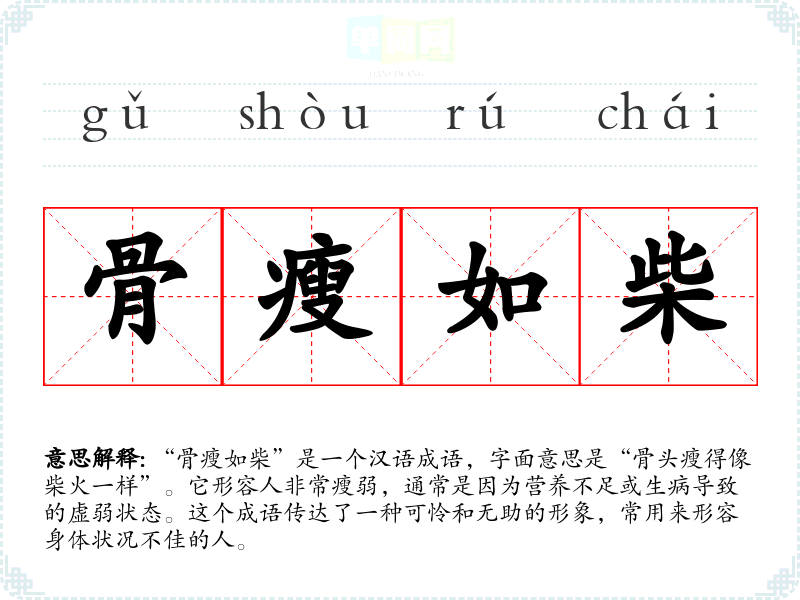 “骨瘦如柴”是一个汉语成语,字面意思是“骨头瘦得像柴火一样”。它形容人非常瘦弱,通常是因为营养不足或生病导致的虚弱状态。这个成语传达了一种可怜和无助的形象,常用来形容身体状况不佳的人。