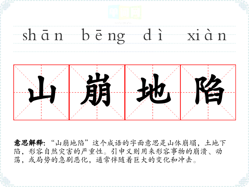 “山崩地陷”这个成语的字面意思是山体崩塌,土地下陷,形容自然灾害的严重性。引申义则用来形容事物的崩溃、动荡,或局势的急剧恶化,通常伴随着巨大的变化和冲击。