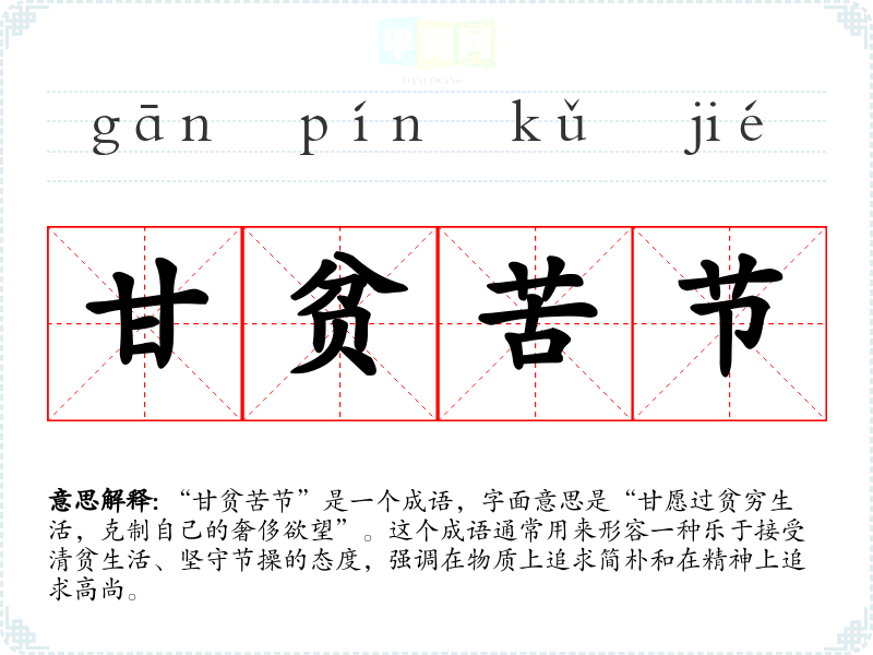 “甘贫苦节”是一个成语,字面意思是“甘愿过贫穷生活,克制自己的奢侈欲望”。这个成语通常用来形容一种乐于接受清贫生活、坚守节操的态度,强调在物质上追求简朴和在精神上追求高尚。