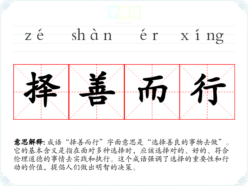 成语“择善而行”字面意思是“选择善良的事物去做”。它的基本含义是指在面对多种选择时,应该选择对的、好的、符合伦理道德的事情去实践和执行。这个成语强调了选择的重要性和行动的价值,提倡人们做出明智的决策。