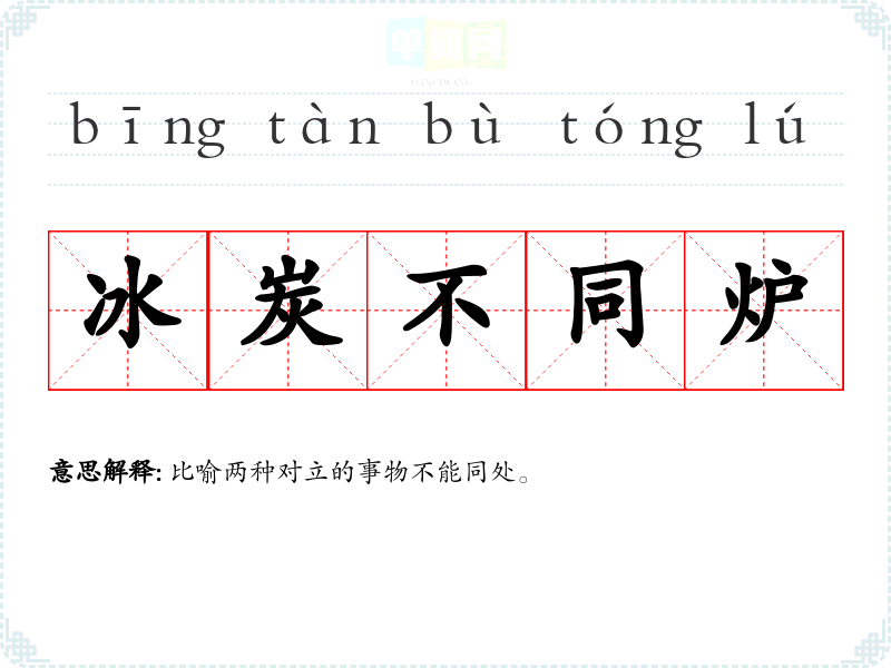 | 冰炭不相容 | 冰:冰块;炭:炭火。比喻两种对立的事物不能并存。 |