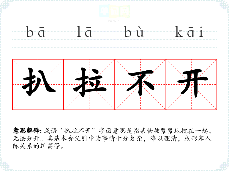 成语“扒拉不开”字面意思是指某物被紧紧地搅在一起,无法分开。其基本含义引申为事情十分复杂,难以理清,或形容人际关系的纠葛等。