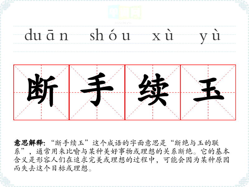 “断手续玉”这个成语的字面意思是“断绝与玉的联系”,通常用来比喻与某种美好事物或理想的关系断绝。它的基本含义是形容人们在追求完美或理想的过程中,可能会因为某种原因而失去这个目标或理想。