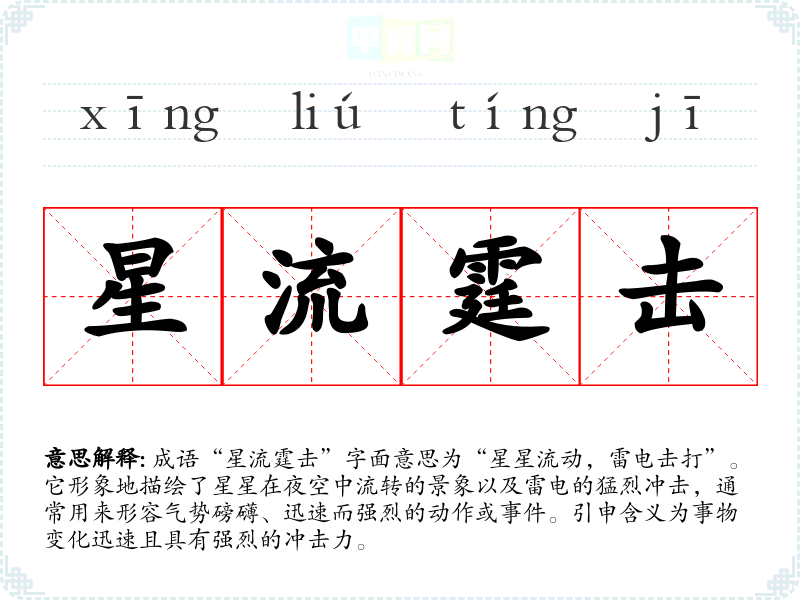 - 反义成语:拖泥带水,缓慢前行。这些成语则强调动作的迟缓和不果断,与“星流霆击”的迅猛形成鲜明对比。