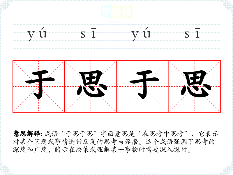 成语“于思于思”字面意思是“在思考中思考”,它表示对某个问题或事情进行反复的思考与琢磨。这个成语强调了思考的深度和广度,暗示在决策或理解某一事物时需要深入探讨。