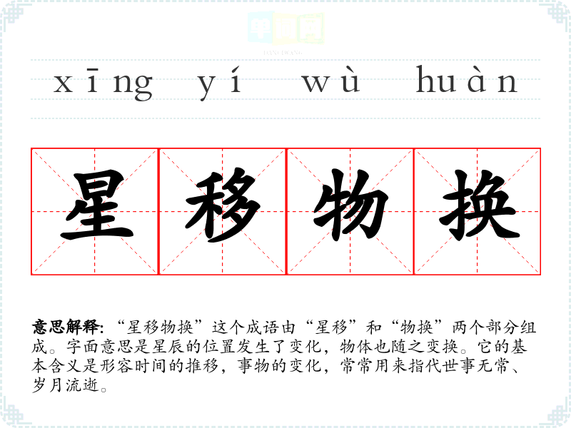 “星移物换”这个成语由“星移”和“物换”两个部分组成。字面意思是星辰的位置发生了变化,物体也随之变换。它的基本含义是形容时间的推移,事物的变化,常常用来指代世事无常、岁月流逝。