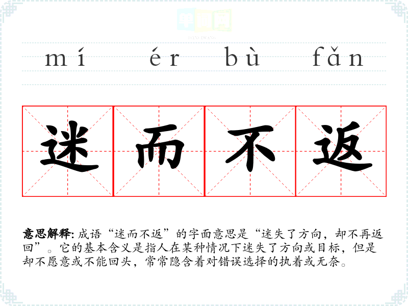 成语“迷而不返”的字面意思是“迷失了方向,却不再返回”。它的基本含义是指人在某种情况下迷失了方向或目标,但是却不愿意或不能回头,常常隐含着对错误选择的执着或无奈。