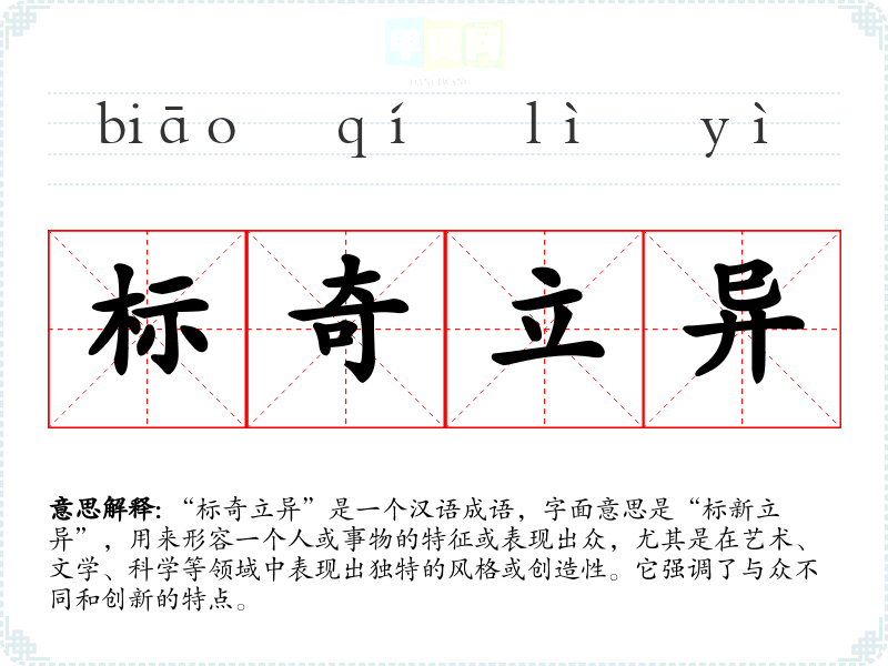 “标奇立异”是一个汉语成语,字面意思是“标新立异”,用来形容一个人或事物的特征或表现出众,尤其是在艺术、文学、科学等领域中表现出独特的风格或创造性。它强调了与众不同和创新的特点。