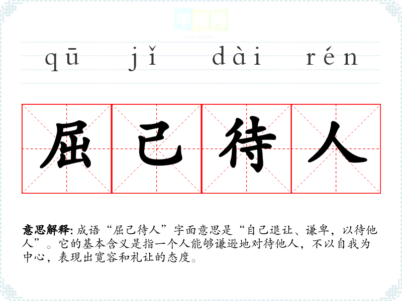 成语“屈己待人”字面意思是“自己退让、谦卑,以待他人”。它的基本含义是指一个人能够谦逊地对待他人,不以自我为中心,表现出宽容和礼让的态度。