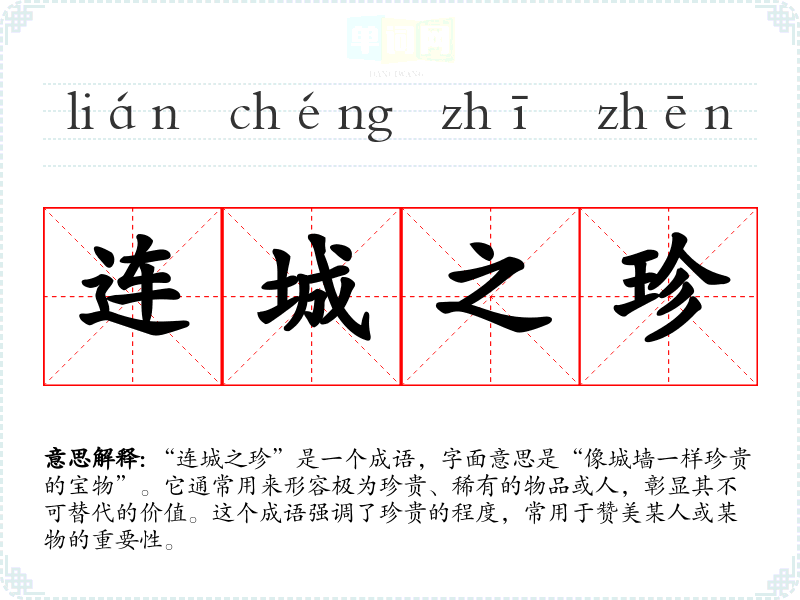 “连城之珍”是一个成语,字面意思是“像城墙一样珍贵的宝物”。它通常用来形容极为珍贵、稀有的物品或人,彰显其不可替代的价值。这个成语强调了珍贵的程度,常用于赞美某人或某物的重要性。
