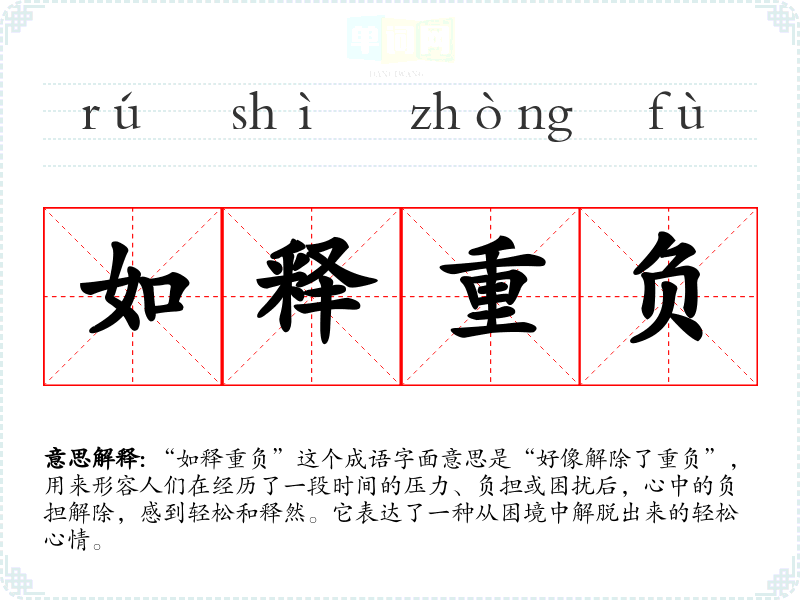 “如释重负”这个成语字面意思是“好像解除了重负”,用来形容人们在经历了一段时间的压力、负担或困扰后,心中的负担解除,感到轻松和释然。它表达了一种从困境中解脱出来的轻松心情。