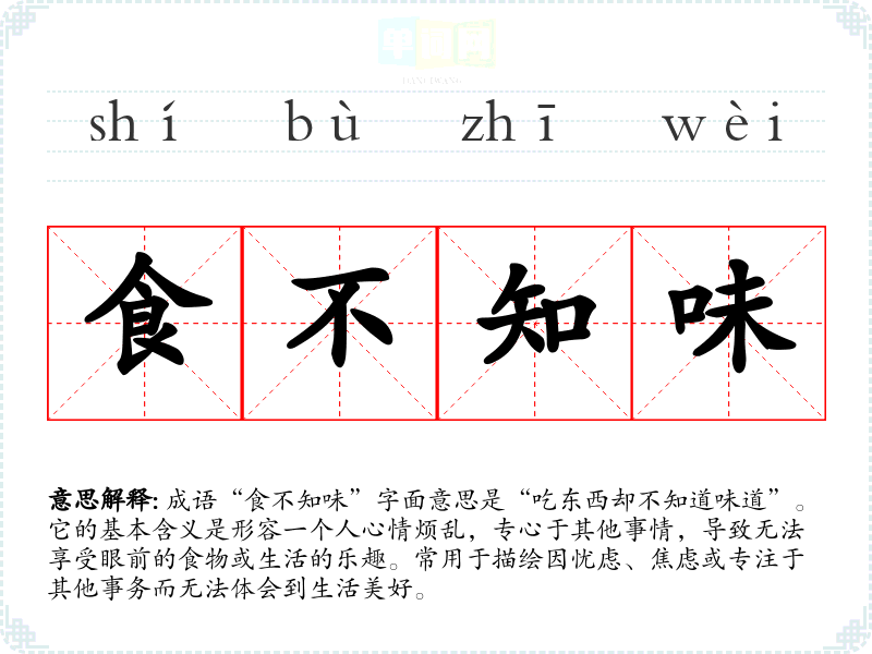 成语“食不知味”字面意思是“吃东西却不知道味道”。它的基本含义是形容一个人心情烦乱,专心于其他事情,导致无法享受眼前的食物或生活的乐趣。常用于描绘因忧虑、焦虑或专注于其他事务而无法体会到生活美好。