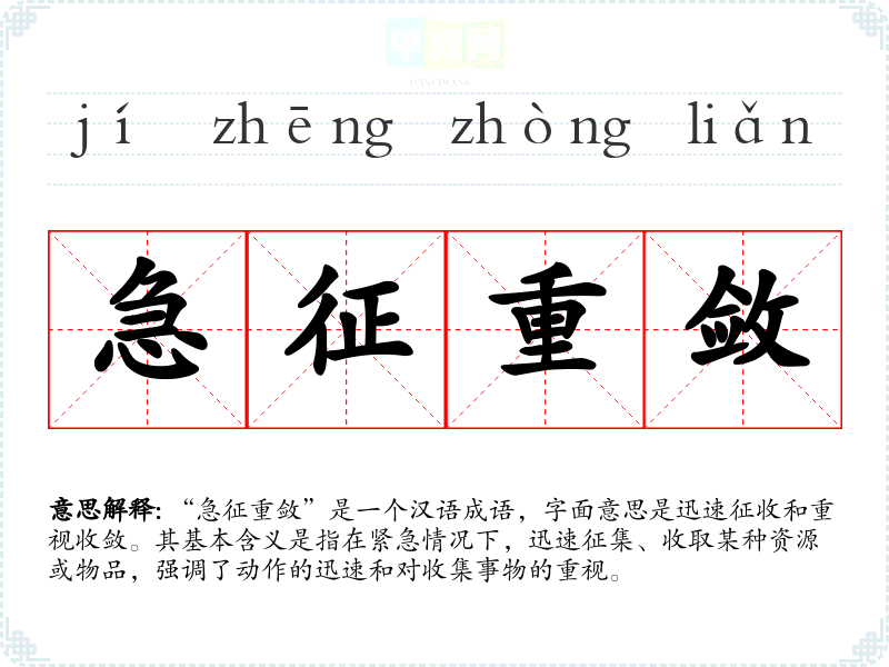 在古代,国家的管理和资源的分配往往与社会的稳定息息相关。因此,“急征重敛”体现了在危机时刻,政府和组织如何快速响应以确保资源的有效利用。现代社会中,该成语可用于描述企业或组织在面对突发**时的快速反应,体现了高效和灵活的管理能力。