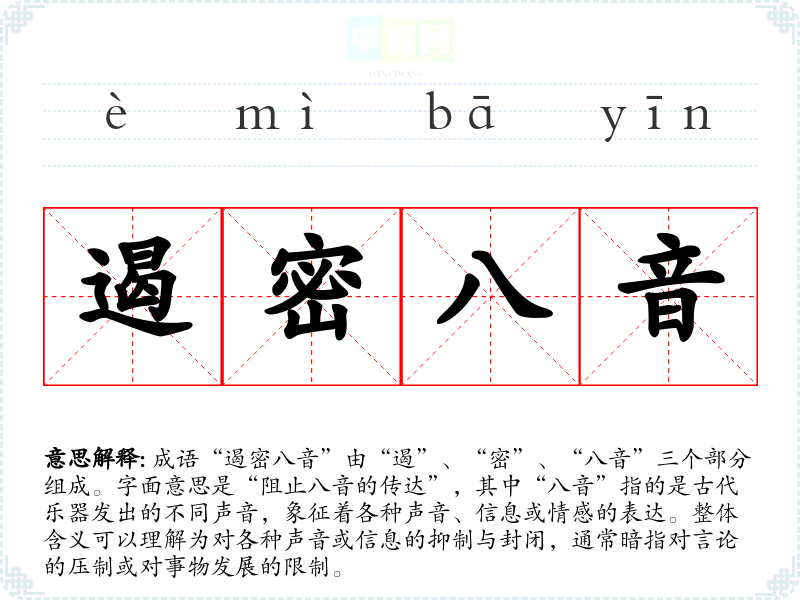 成语“遏密八音”由“遏”、“密”、“八音”三个部分组成。字面意思是“阻止八音的传达”,其中“八音”指的是古代乐器发出的不同声音,象征着各种声音、信息或情感的表达。整体含义可以理解为对各种声音或信息的抑制与封闭,通常暗指对言论的压制或对事物发展的限制。